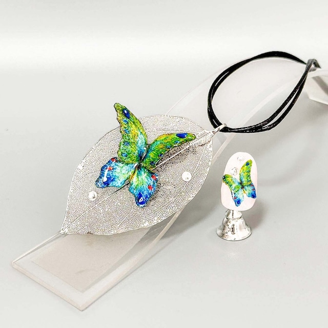 ヘレナモルフォ蝶ブローチ&ネックレストップ(お揃いの親指用付け爪セット付)