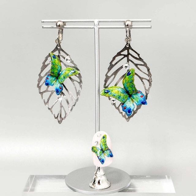 緑瑠璃蝶の木の葉イヤリング大(お揃いの親指用付け爪セット付)