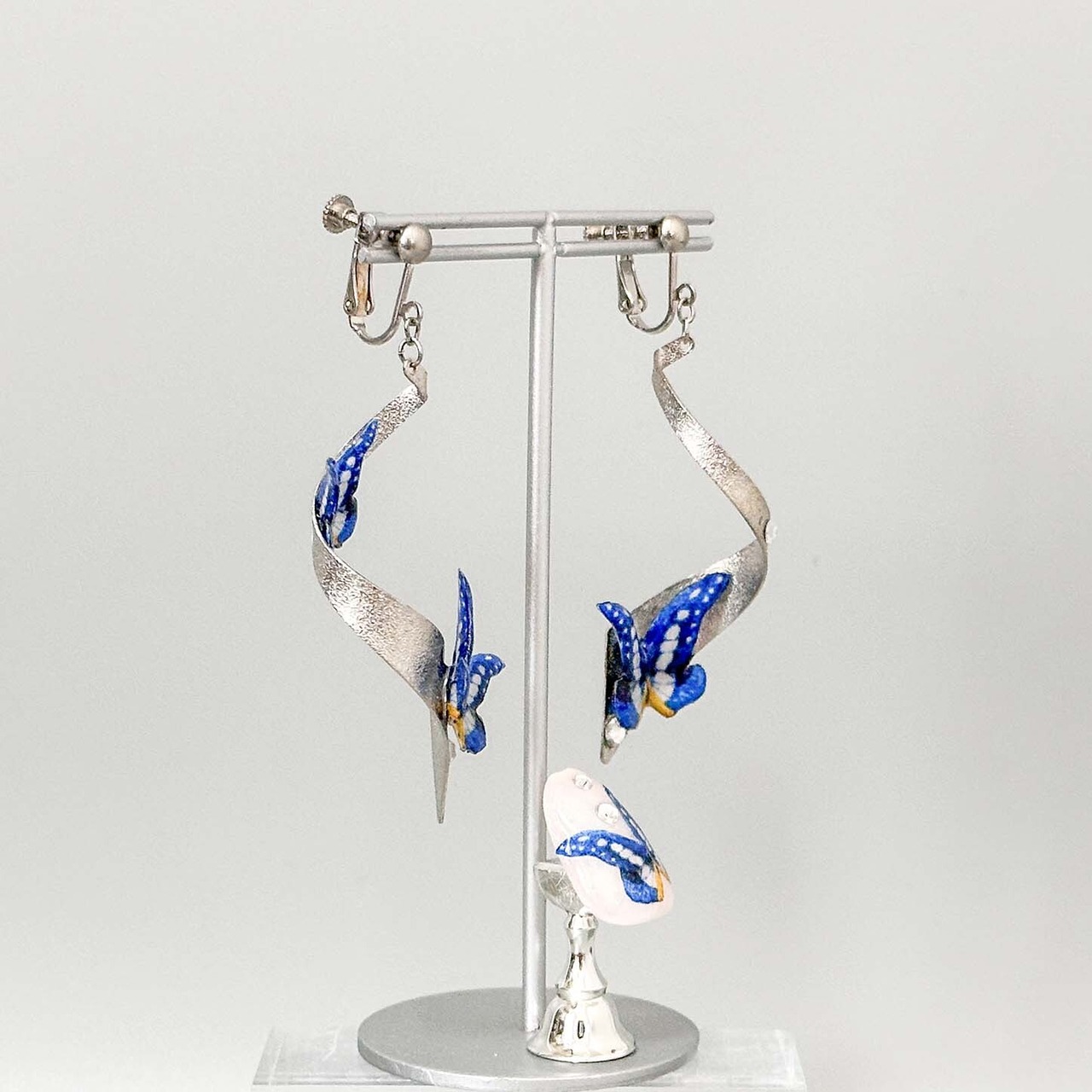 このヘレナモルフォ蝶のらせんイヤリングは、個性的で美しいデザインが特徴で、らせん状に蝶が飛んでいるように留まらせているので、揺れるたびにどこか幻想的でありながらも洗練された印象を与えます。