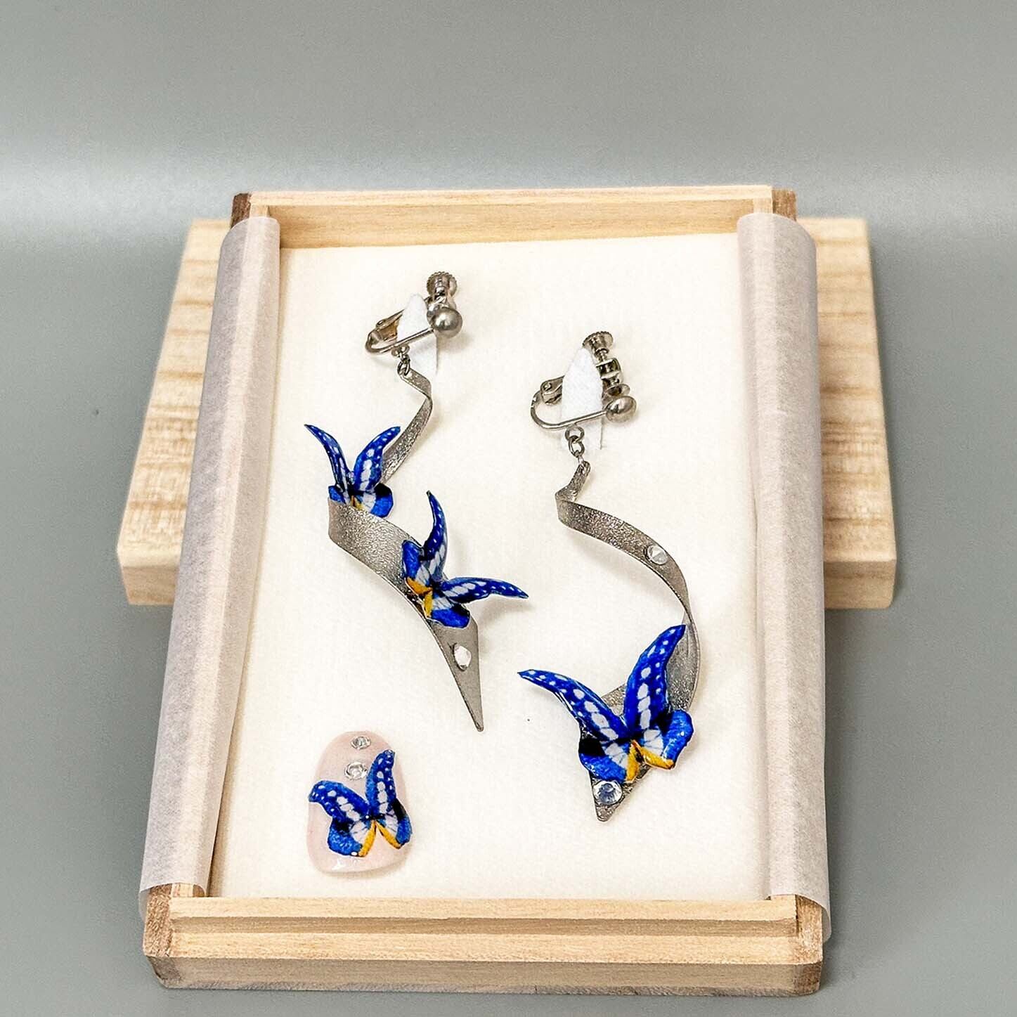 立体刺繡Sayokoが制作した羽が開いたり閉じたりと本物の蝶と同じ動き形状ができるヘレンモルフォ蝶のブローチとお揃いのデジタルヘレナモルフォ蝶のらせんイヤリングです。