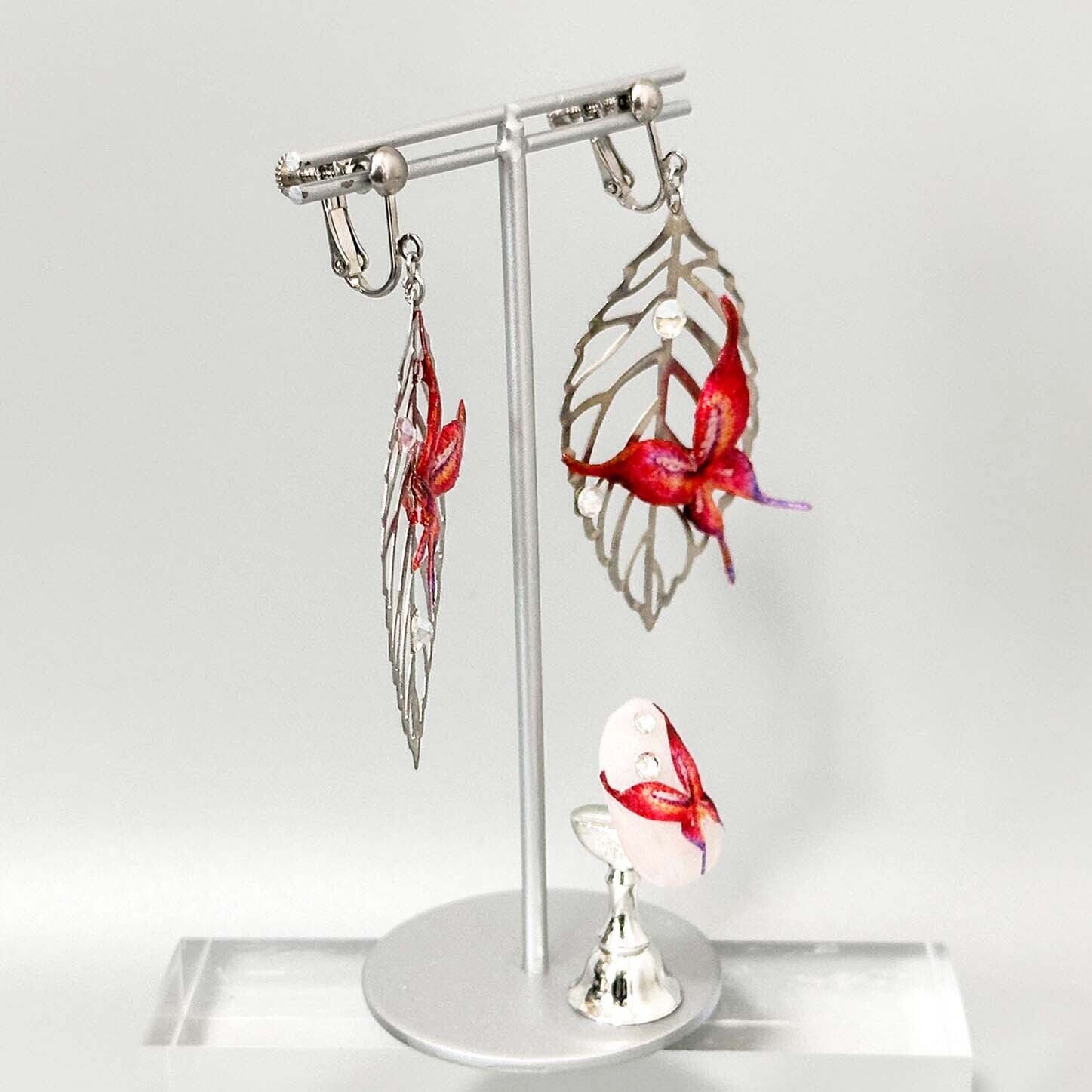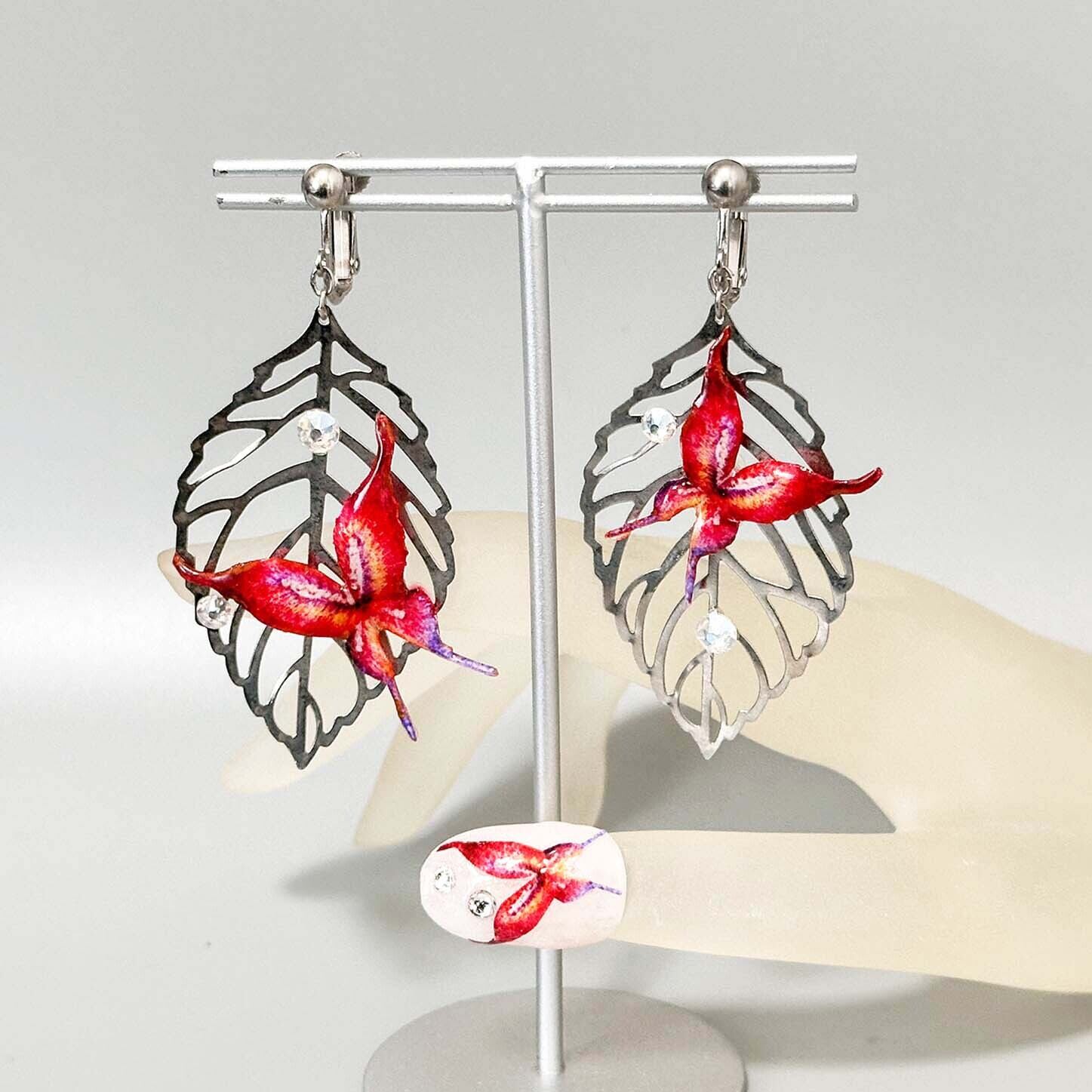 羽が開いたり閉じたりと、本物の蝶のように動きを感じられる立体刺繍のレッド蝶と、木の葉をモチーフにしたイヤリングが重なり合うことで、幻想的で洗練された印象を与えます。