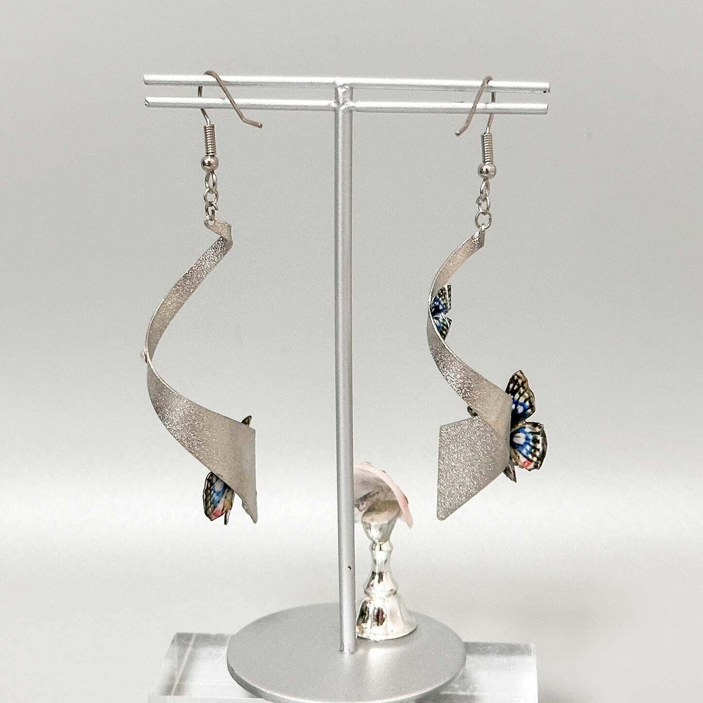 らせんイヤリングに舞い降りた蝶を思わせるデザインは、揺れるたびに幻想的で洗練された印象を与えます。