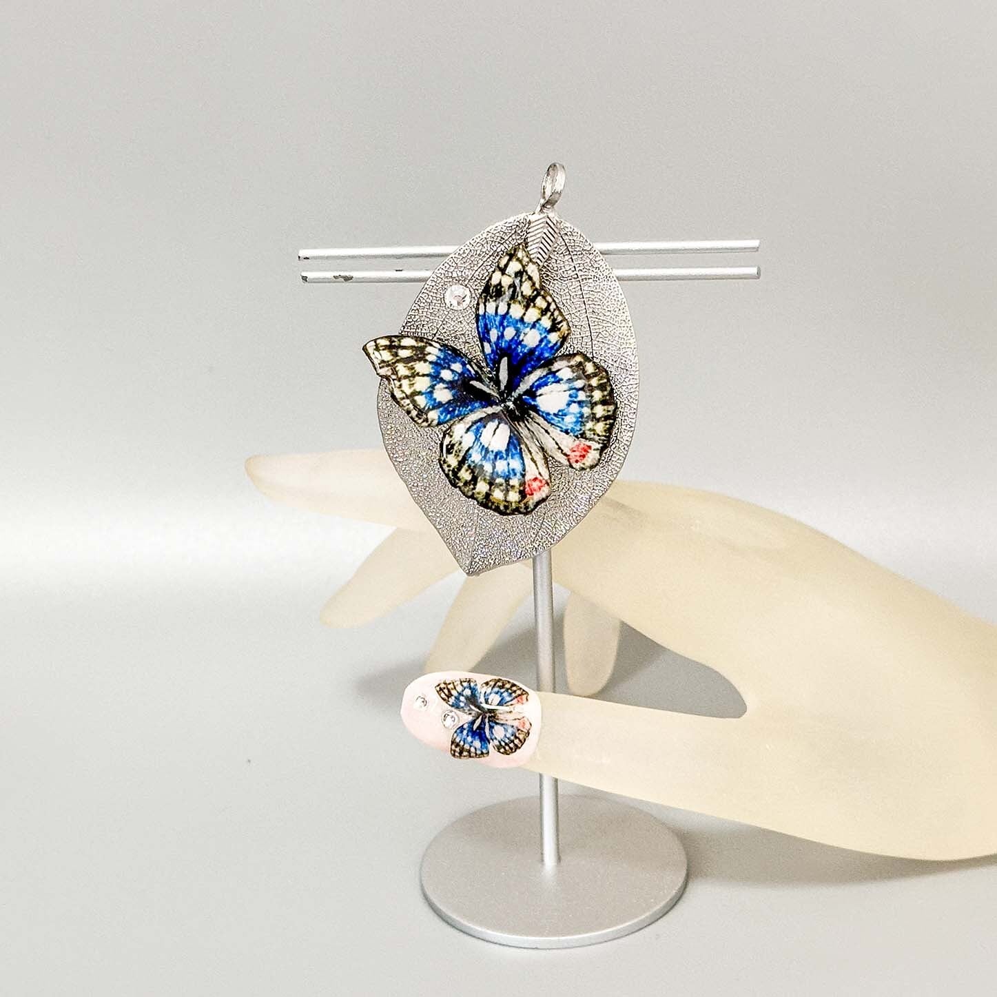 さらに、親指用付け爪にはブローチ&ネックレストップとお揃いのオオムラサキのデジタルデザインをあしらい、指先にも蝶の煌めきを添えました。身に着けるアートジュエリーをより一層楽しめる特別なアクセントです。