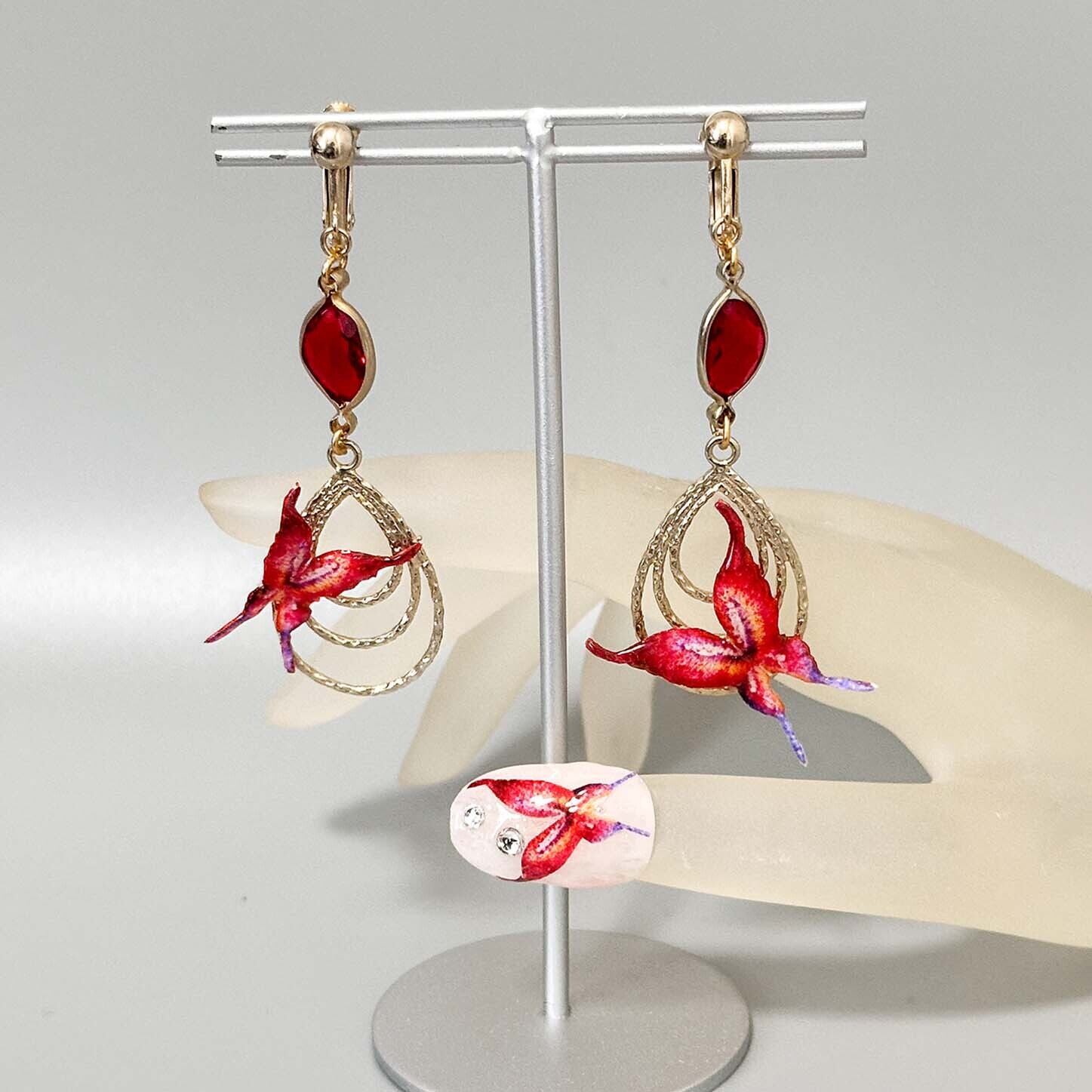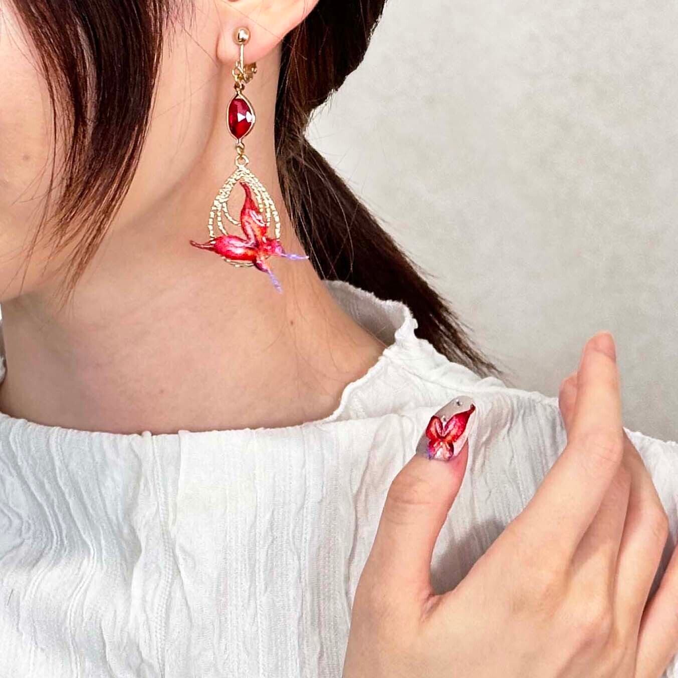 さらに、親指用付け爪にはイヤリングとお揃いのレッド蝶のデジタルデザインをあしらい、指先にも蝶の煌めきを添えました。身に着けるアートジュエリーをより一層楽しめる特別なアクセントです。