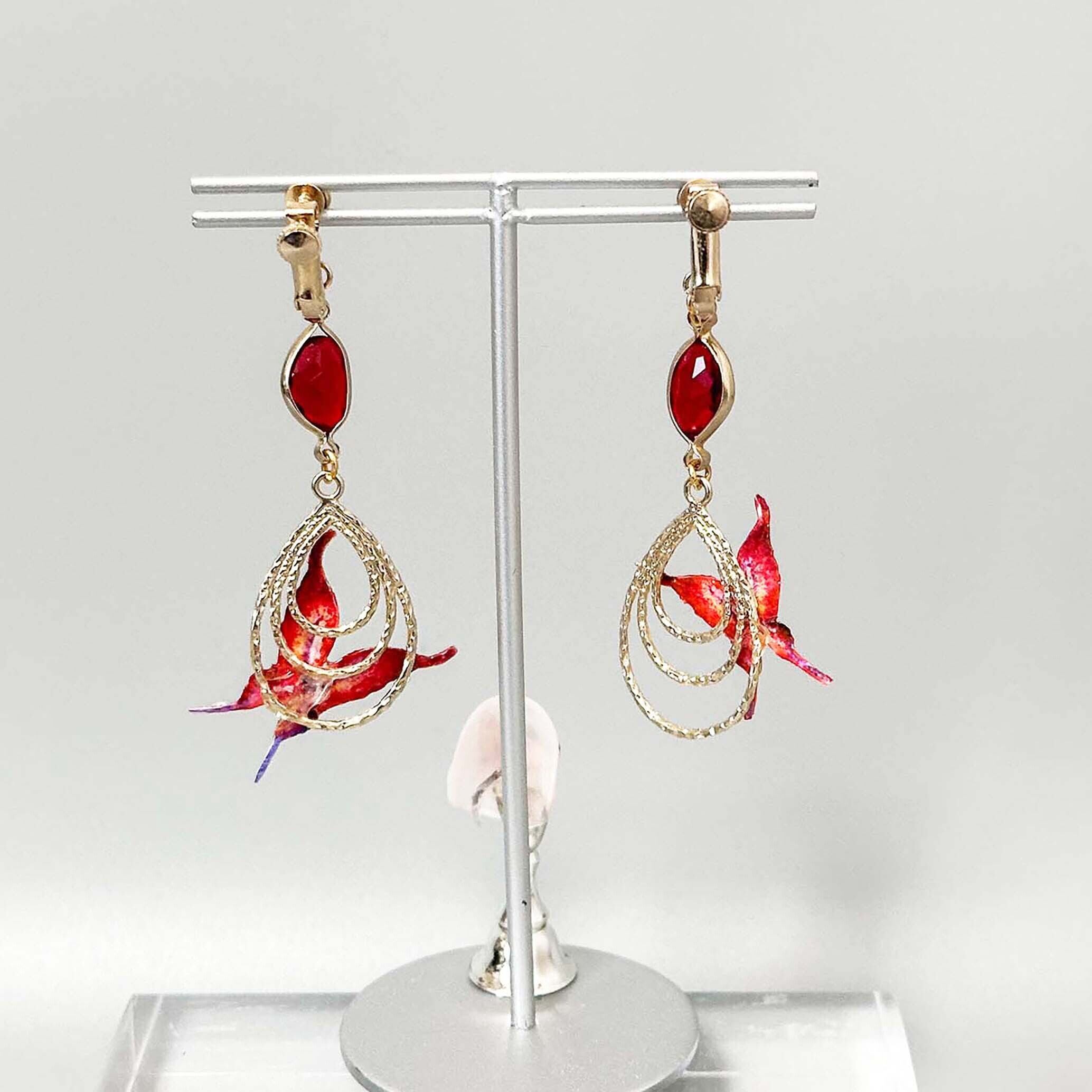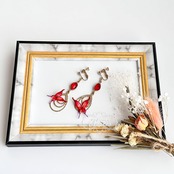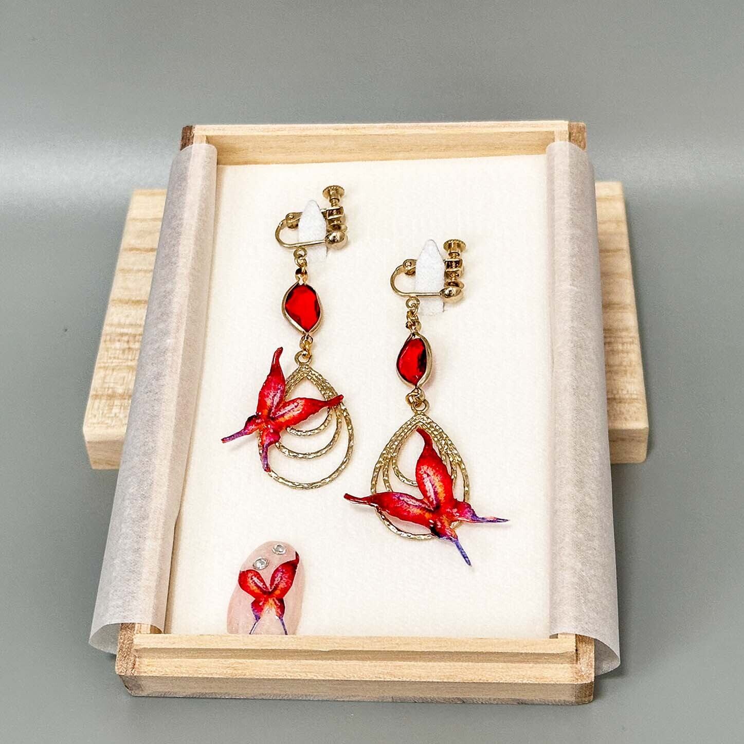 その美しいレッド蝶と真っ赤なスワロスキーイヤリングが重なり合ったデザインは、どこか幻想的でありながらも洗練された印象を与え、華やかなスタイルからシンプルなコーディネートまで、幅広いファッションにマッチするアクセサリーです。