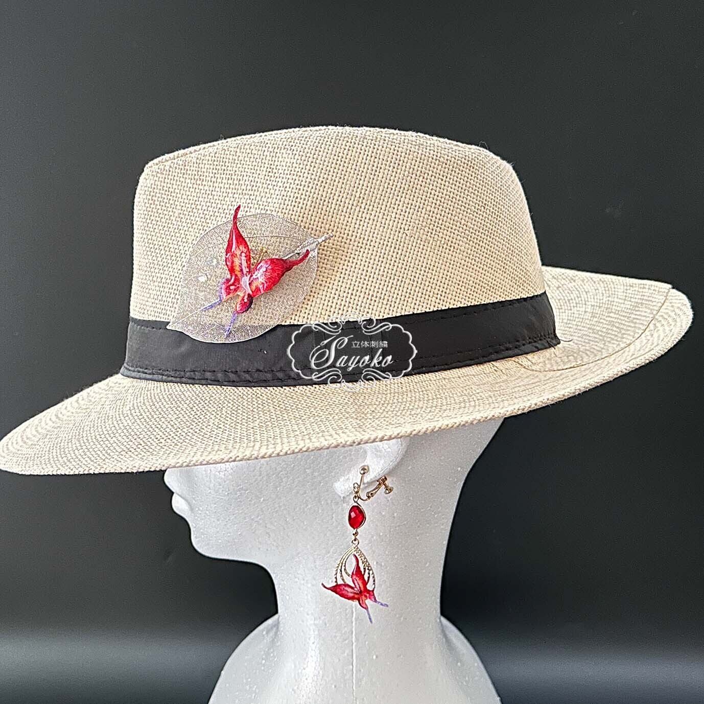 羽が開閉し、本物の蝶のように生き生きとした動きを見せる立体刺繍のレッド蝶。