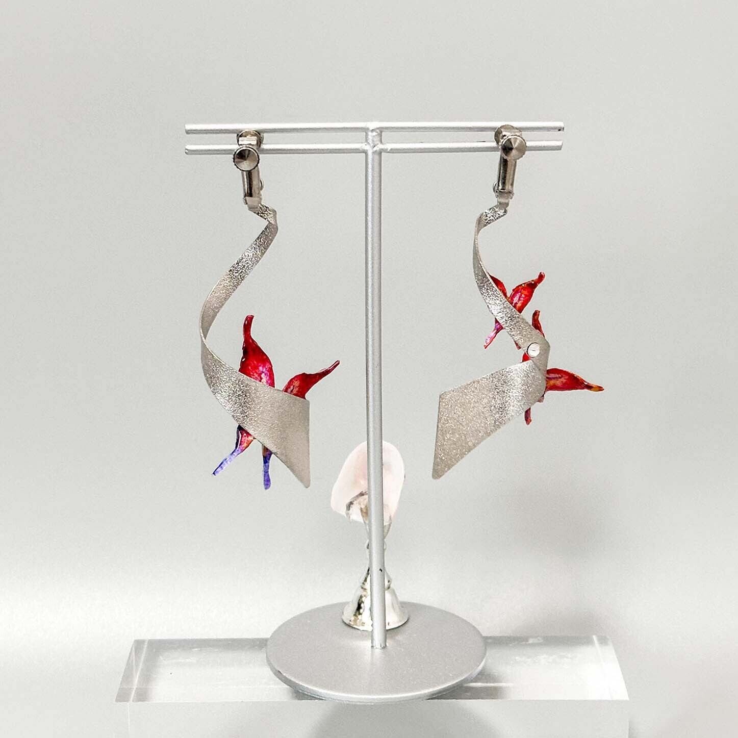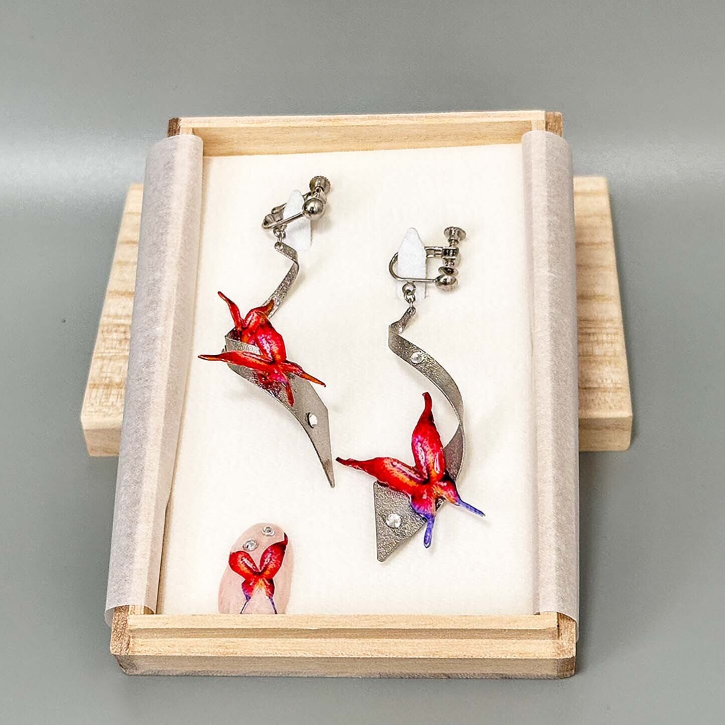 色や大きさが異なる5匹のカラー蝶ブローチの中でも、ひときわ鮮やかに輝いた「レッド蝶」をモチーフにしています。