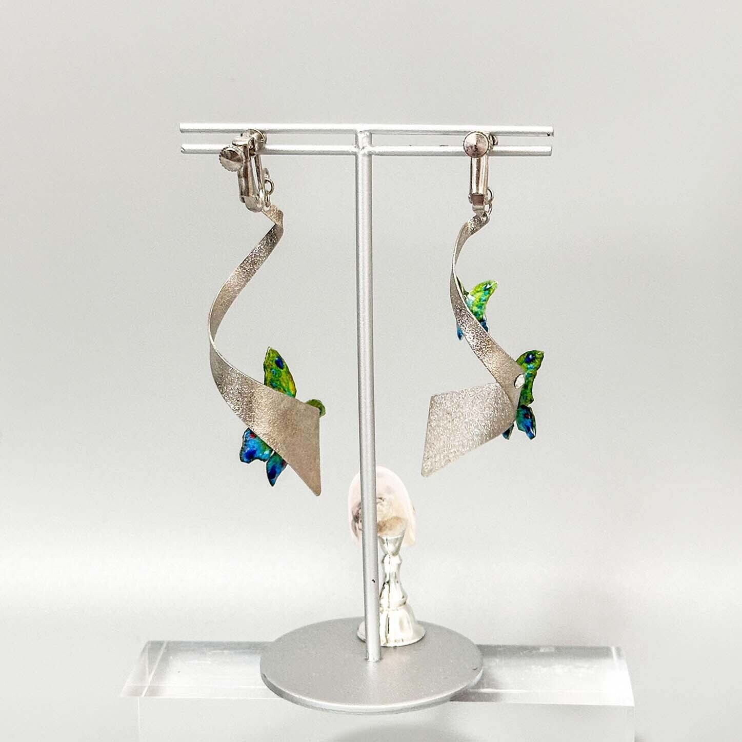 左右で大きさの異なる蝶をイヤリングに留めることで、まるで蝶がひらひらと舞うような動きと立体感を演出。装着時にはバランスの良さと遊び心のあるデザインを楽しめます。