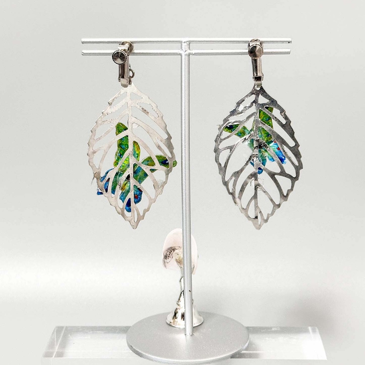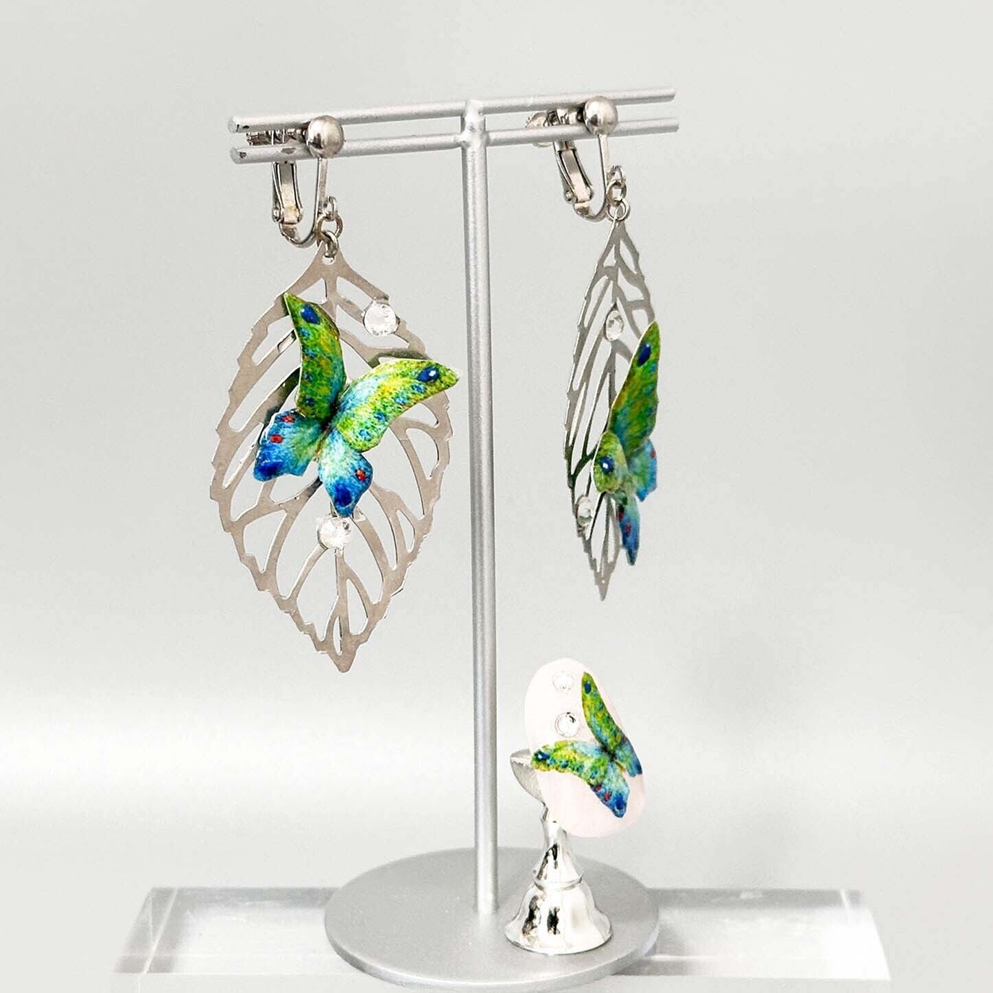 翡翠の輝きをまとった緑瑠璃蝶と、木葉をモチーフにしたイヤリングの調和は、幻想的でありながらも洗練された印象を与えます。